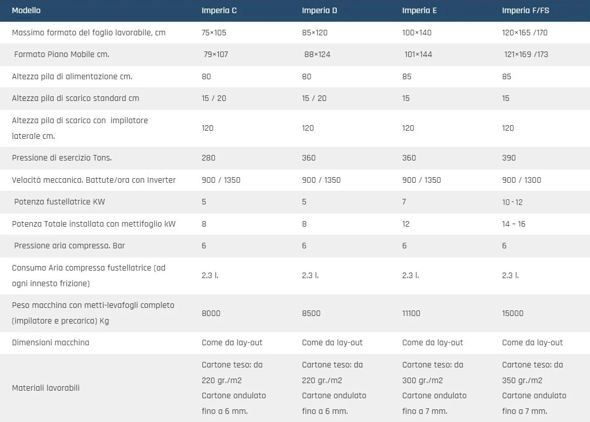 In abbinamento con il mettilevafoglio automatico, la platina fustellatrice IMPERIA migliora la produzione, con l’automazione delle operazioni di carico e scarico dei fogli.